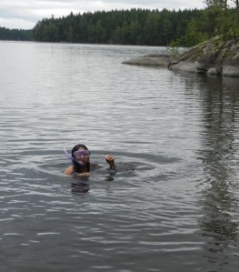 We soon learned that a common practice in inland lakes was to tie weights (or sinkers) like these onto the ends of fishing nets to get them to drop into deeper waters. And, the practice dates to the stone age. Sinkers could be made solely of rocks with a hole pierced in one end, of rocks with the birch bark folded over and tied or in puches like this, or even some in a wheel-shape with the rock and bark in the center. While we still don’t know the age of this particular weight, it was an exciting find nonetheless that taught us about an aspect of fishing and Finnish culture we knew nothing about.
